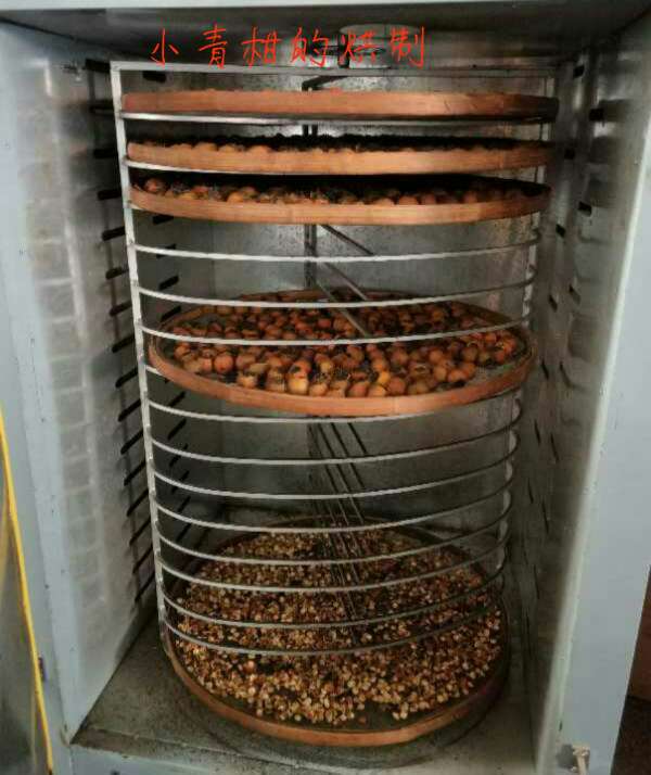 下面的是2018年12月公司用普洱的陳皮與公司的茶葉結(jié)合,制作的小青柑。青柑工藝種類的區(qū)別主要出現(xiàn)在干燥環(huán)節(jié),干燥方式的不同使之形成了不同的風(fēng)味與口感。烘制時(shí)間是18個(gè)小時(shí),低溫烘焙,采用60℃左右的溫度,將小青柑烘焙至干燥。時(shí)間和成本雖有提高,但比起高溫烘焙工藝來(lái)說(shuō),口感更好,提香適當(dāng),兼以保持了活性,為后期轉(zhuǎn)化保留了空間。